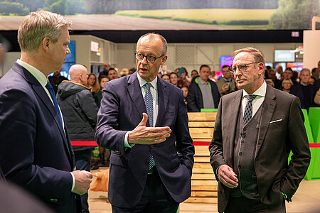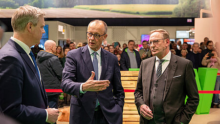 Genossenschaften als Unternehmen der Landwirte: Bundeskanzler Friedrich Merz im Gespräch mit DRV-Präsident Franz-Josef Holzenkamp (rechts) und Westfleisch-Vorstand Michael Schulze Kalthoff (links), Bildquelle: DRV.