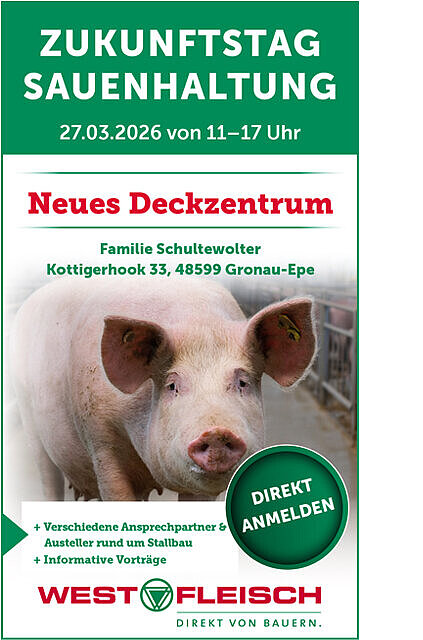 Westfleisch lädt alle interessierten Ferkelerzeuger herzlich zum „Zukunftstag Sauenhaltung” ein. Die Veranstaltung findet am Freitag, den 27. März 2026, von 11 bis 17 Uhr auf dem Betrieb der Familie Schultewolter in Gronau-Epe statt.